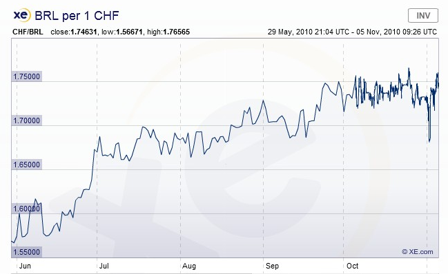 Nicht nur wir bereiten uns auf die Abreise vor, sondern auch die betroffenen Währungen. Damit es für das Schwiizer Fränkli mehr Brasilianische Real gibt, holt die Kurve mal so richtig Anlauf, wie diese Kurve zeigt: